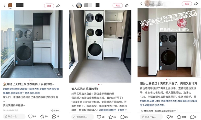 同时,海信热泵洗烘一体机棉花糖E8Q还可以在上方叠加小双筒,变成海信全家筒棉花糖E8Q三筒洗衣机(WH130E8Q+WV20G-H、WH130E8Q-1+WV20W),能实现3洗+3烘+3智能投放,既可同洗同烘也能单筒独立工作,彻底告别所有混洗将就,满足大人、孩子、内衣、深浅色的精细分区需求。有用户赞叹:“家里人多,每天要洗衣服的量比较大,所以这次主要选择海信三筒洗衣机,对比了市面上主流的几款机型,始终选择了海信棉花糖,直驱电机运行噪音小,分区洗衣干净卫生,很值得推荐!”